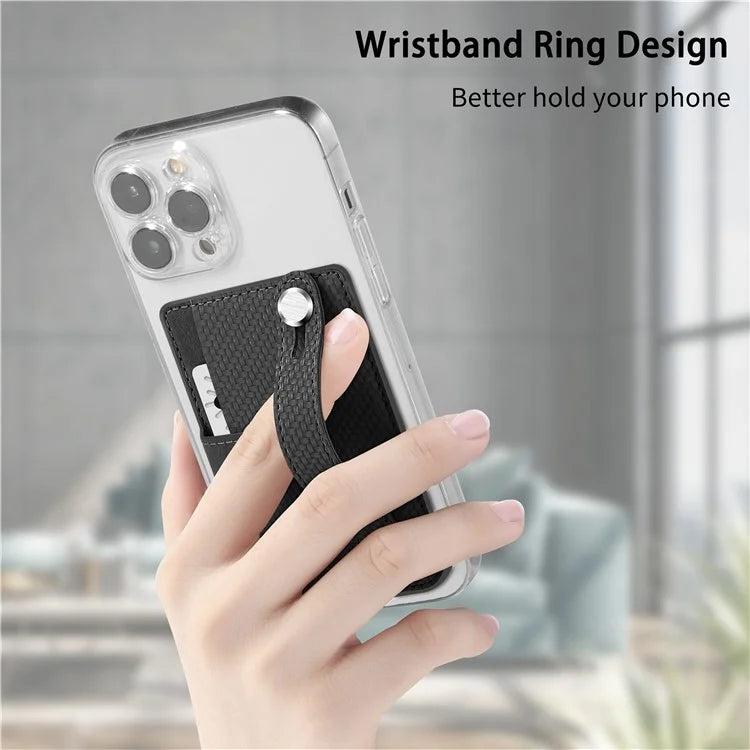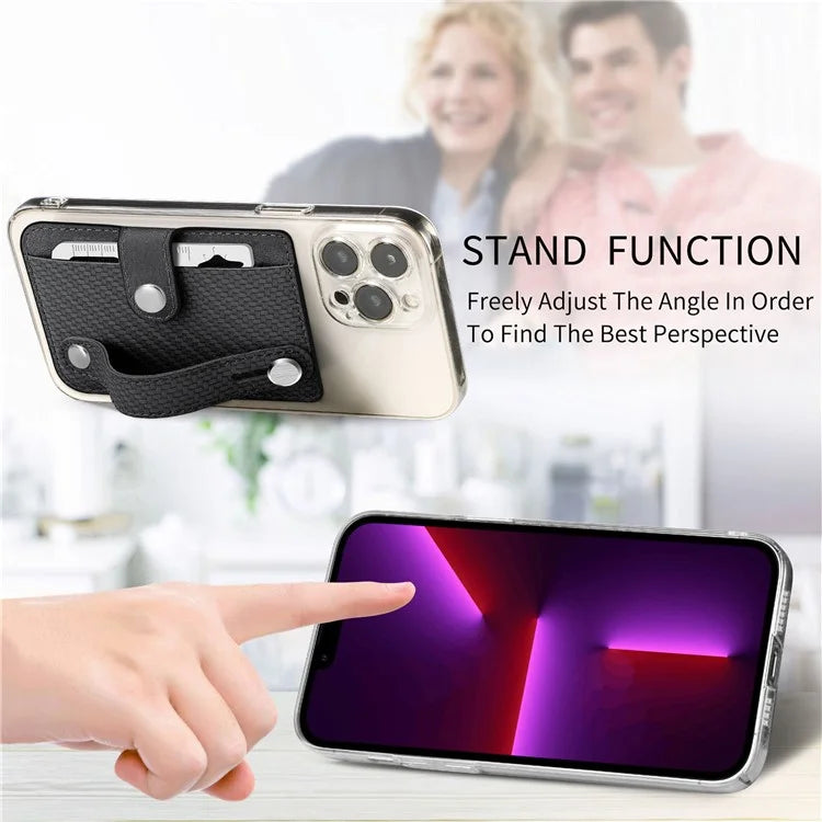 The TASX Carbon Fiber Phone Card Holder combines functionality and style in a compact design. Crafted from premium PU leather with a sleek carbon fiber texture, this holder is as durable as it is stylish. It features integrated card slots to securely store your essentials, eliminating the need for a separate wallet. The strong double-sided adhesive ensures a reliable attachment to your phone. The versatile wristband doubles as a convenient kickstand for hands-free use, while the secure snap button keeps your cards and valuables safe. Plus, the multifunctional card knife adds a practical tool for everyday use.