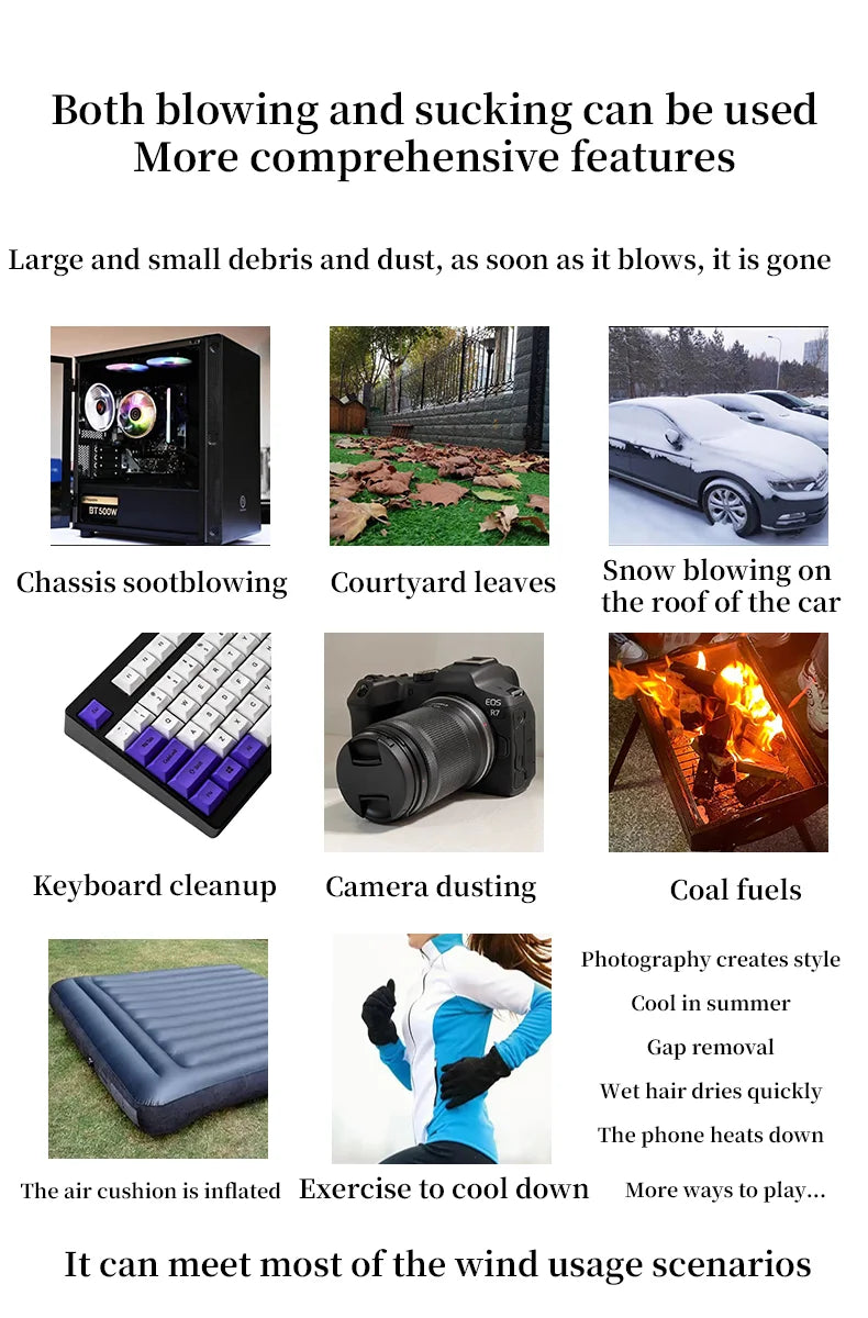 - Versatile Design: Ideal for cleaning keyboards, removing snow from car roofs, or personal cooling.