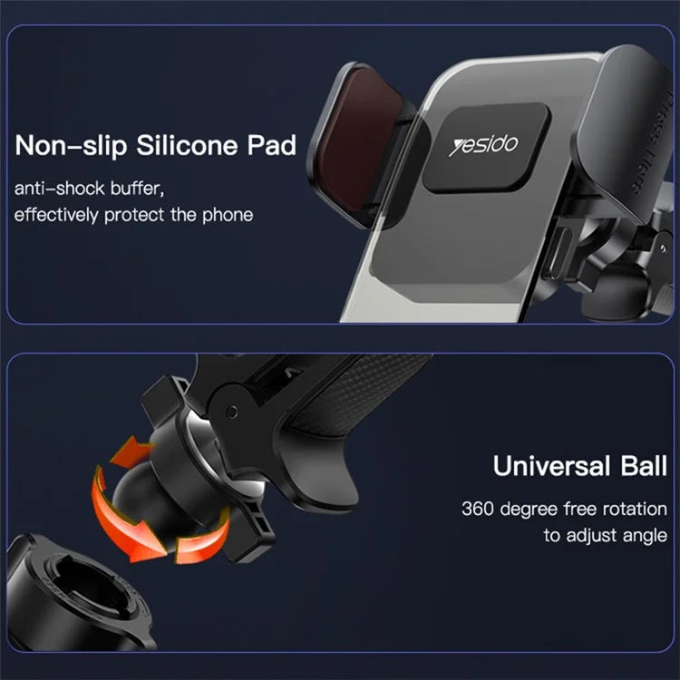 The YESIDO C163 Car Phone Holder features a triangle design for a stable grip and secure phone lock. Compatible with phones ranging from 6.5 to 9.5 cm in width, it can be used with or without a case. The 360° rotating design allows you to easily adjust the viewing angle, while the thickened silicone cushion provides extra protection. With a reserved charging port, you can charge your phone while using it for navigation.