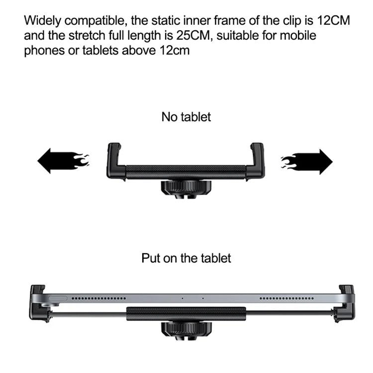 - Wide Compatibility – The static inner frame is 12cm, and the stretchable length reaches 25cm, making it suitable for devices from 4.7" to 12" (smartphones or tablets).